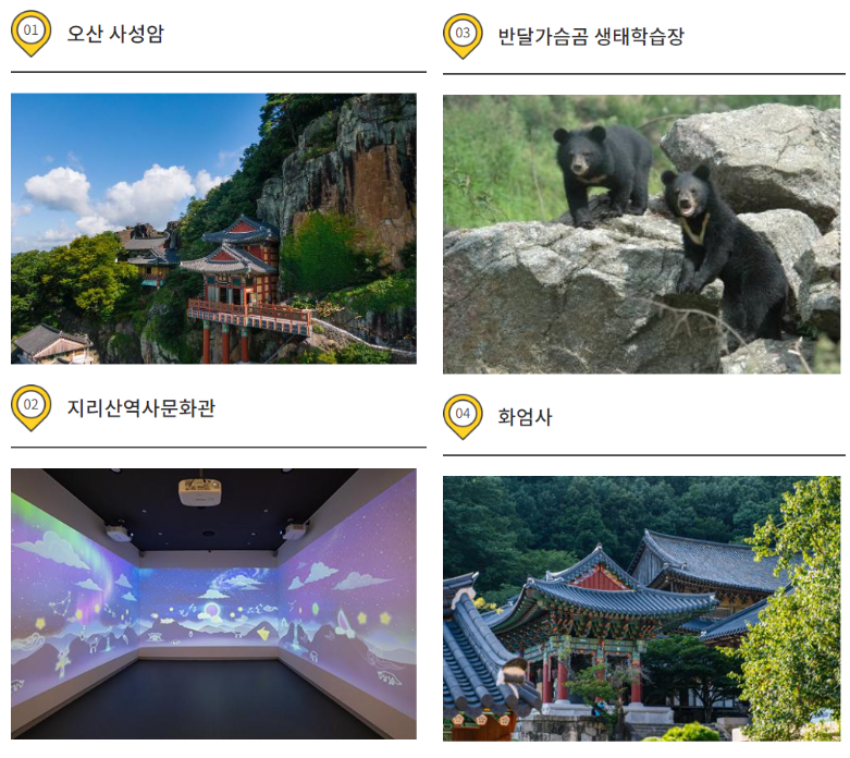 1일 : 오산 사성암 >> 지리산역사문화관 >> 반달가슴곰 생태학습장 >> 화엄사