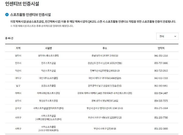 ● 지정된 체육인증시설은 총 46곳이 있고 국민체력 100 홈페이지에서 확인하실 수 있습니다.