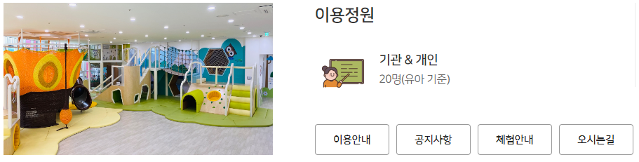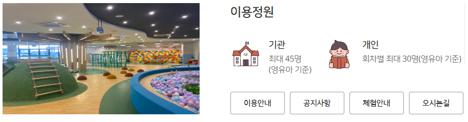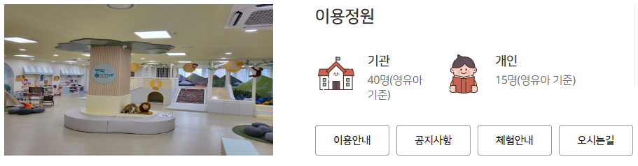 - 이용연령 : 개인은 취학 전 영유아(2017년생 ~ 2023년생) 및 보호자/ 단체는 성동구 관내 어린이집대상