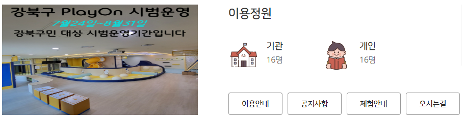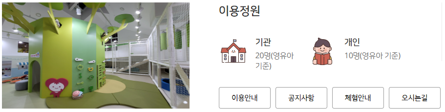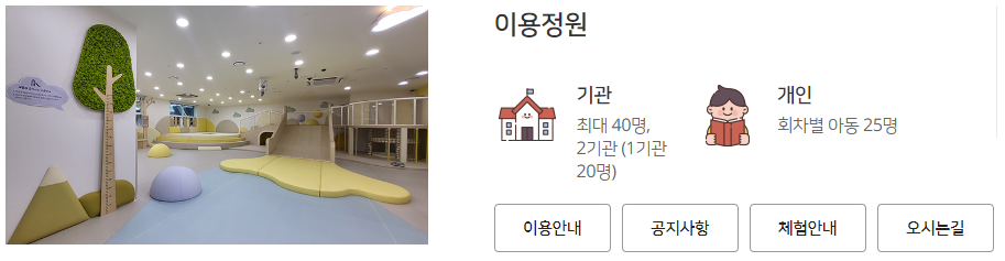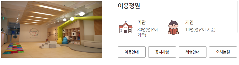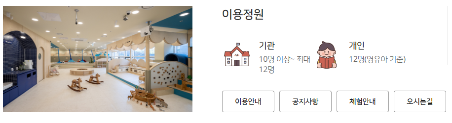 - 이용연령 : 개인은 서울시에 거주하는 12개월 이상 미취학 영유아와 부모(보호자)