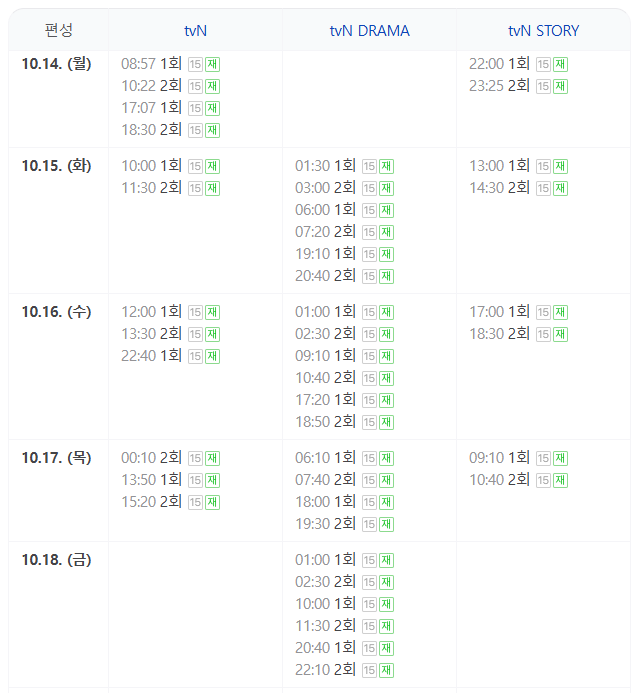 정년이의 재봉송은 첫 방영 이후 다양한 시간대에 걸쳐 편성될 예정입니다. tvN, tvN DRAMA, tvN STORT 채널에서 재방송될 예정이며 10월 14일부터 18일까지의 재방송 편성표 일정은 아래와 같습니다. 이후 편성표 일정은 계속 업데이트되며 편성 시간 확인은 아래 버튼을 통해 하실 수 있습니다.