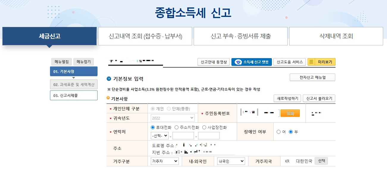 종합소득세 모두채움 서비스는 혼자서 직접 종합소득세를 신고하시는 많은 분들을 위해 간편하게 2022년 귀속 수입금액과 필요경비 납부세액등이 신고서에 작성되어 있는 서비스를 말합니다. 이렇게 신고서작성 되어 있으니 어디에 무엇을 어떻게 작성해야 할지 고민하셨던 많은 분들도 쉽게 종합소득세를 신고하실 수 있습니다.