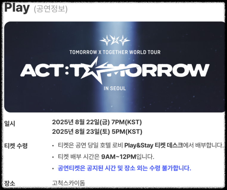 - 공연명: TOMORROW X TOGETHER WORLD TOUR 〈ACT : TOMORROW〉 IN SEOUL