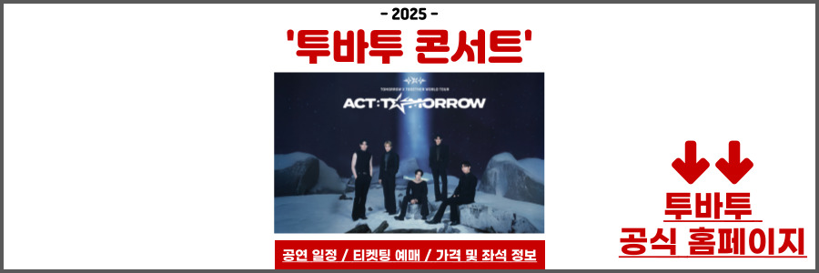 2025년 하반기 투바투의 네 번째 월드투어 'ACT: TOMORROW' 서울 공연이 확정되었습니다. 이번 공연은 고척스카이돔에서 열리는 단독 콘서트로, 투바투의 새로운 챕터를 여는 기념비적인 무대가 될 예정입니다. 이번 글에서는 서울 고척스카이돔에서 열리는 2025 투바투 콘서트 일정, 티켓팅 예매 방법, 티켓 가격, 좌석 배치도, 스페셜 패키지(Play&Stay)정보를 정리해 드립니다. 티켓팅에 성공하고 싶은 MOA라면 꼭 끝까지 확인해보세요!