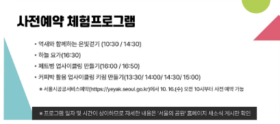 위 프로그램들은 서울공공서비스예약 홈페이지(https://yeyak.seoul.go.kr)에서 사전예약이 가능하며 2024년 10월 16일(수) 오전 10시부터 예약이 시작되었습니다. 선착순으로 참여가 제한될 수 있으니 미리 예약을 서두르는 것이 좋습니다.