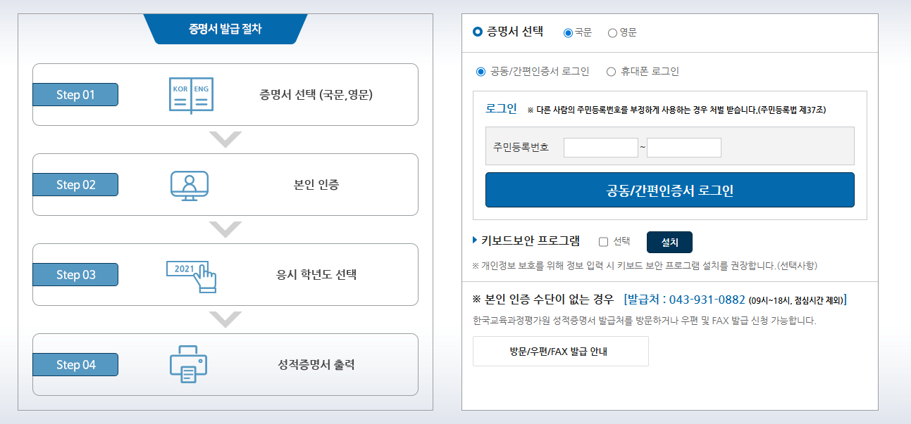 한국교육과정평가원 성적증명서 발급시스템을 통한 조회 방법은 다음과 같습니다.